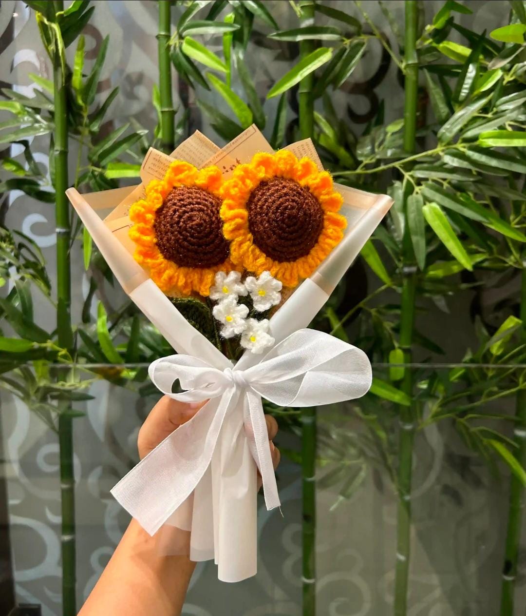 Bring warmth and tenderness into any space with the Sunshine & Serenity Crochet Bouquet, a handcrafted arrangement that blends the bold beauty of sunflowers with the soft charm of forget-me-not blooms. Featuring 2 vibrant yellow sunflowers, 4 delicate white flowers, and 2 lush green leaves, this bouquet captures the joy of summer and the sweetness of memories in one lasting creation. Thoughtfully tied with a white ribbon bow and wrapped in premium bouquet paper, it makes for a stunning gift or heartfelt décor accent that never fades.